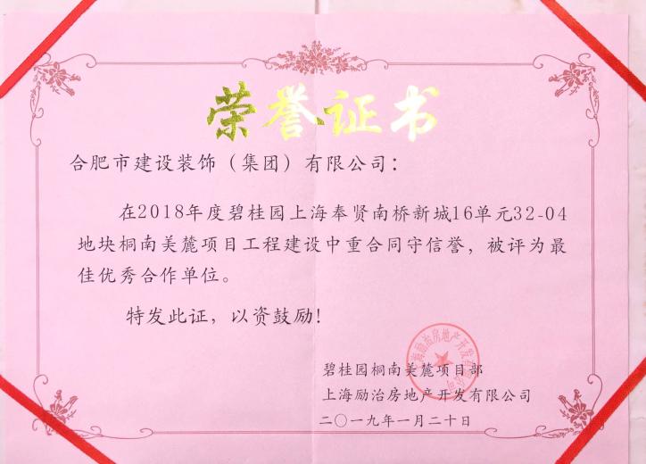 2018年度碧桂园上海奉贤南桥新城16单元32-04地块桐南美麓项目工程建设者重合同守信誉,被评为最佳优秀合作单位