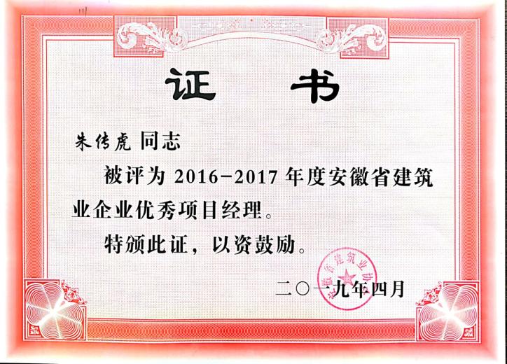 2016-2017年安徽省建筑业优秀项目经理——朱传虎