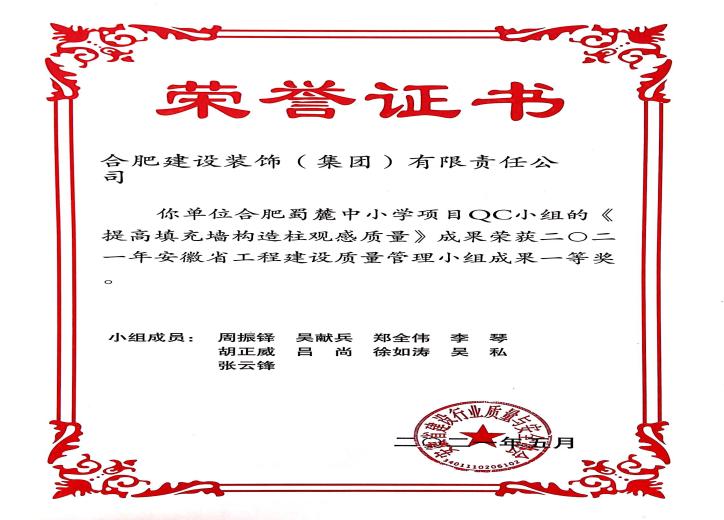合肥蜀麓中小学项目QC小组《提高填充墙充构造柱观感质量》——2021年安徽省工程建设质量管理小组一等奖