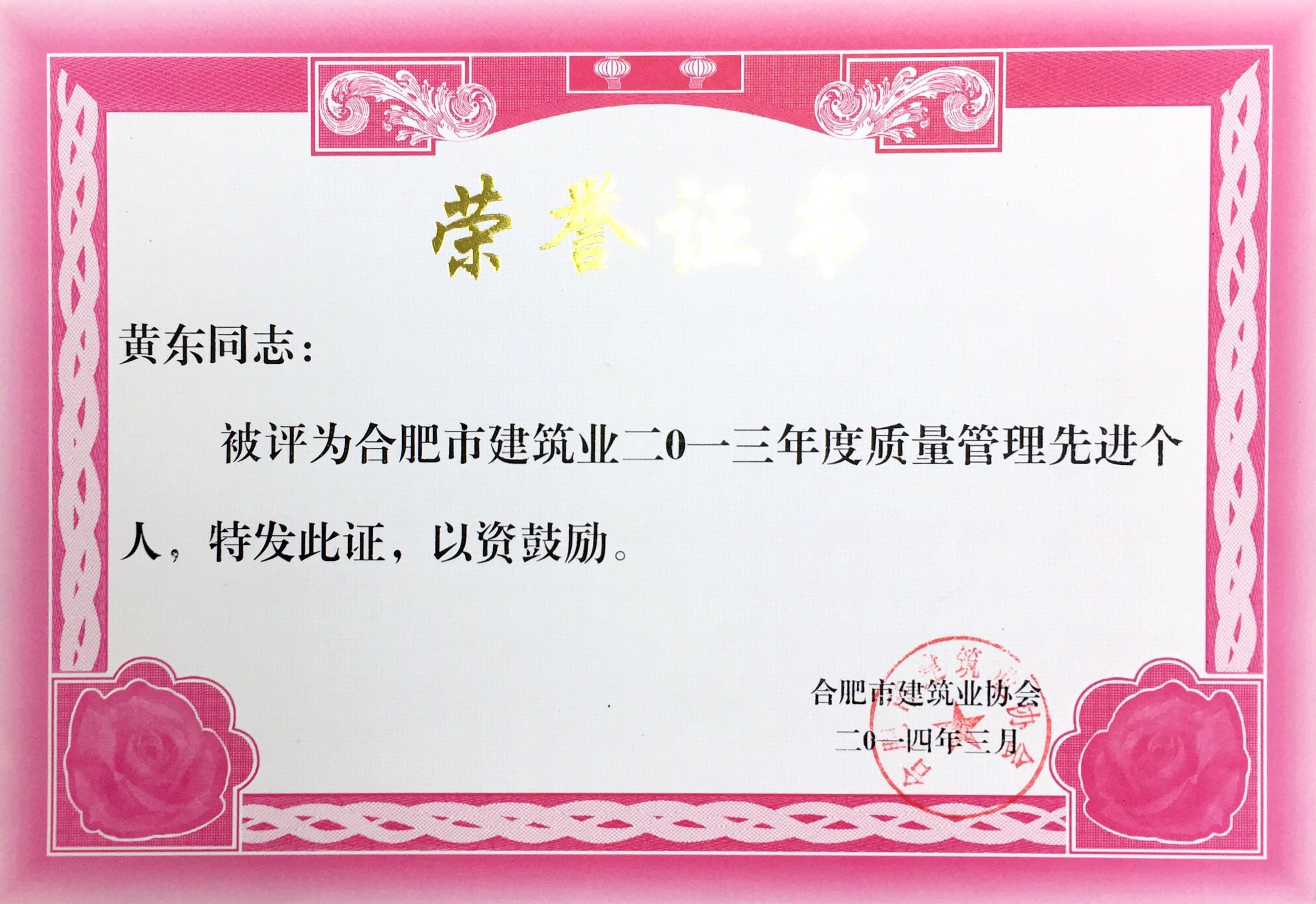 >合肥市建筑业2013年度质量管理先进个人——黄东