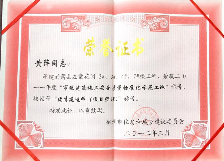 >萧县左岸花园4#楼工程被授予优秀建造师(项目经理)--黄阵