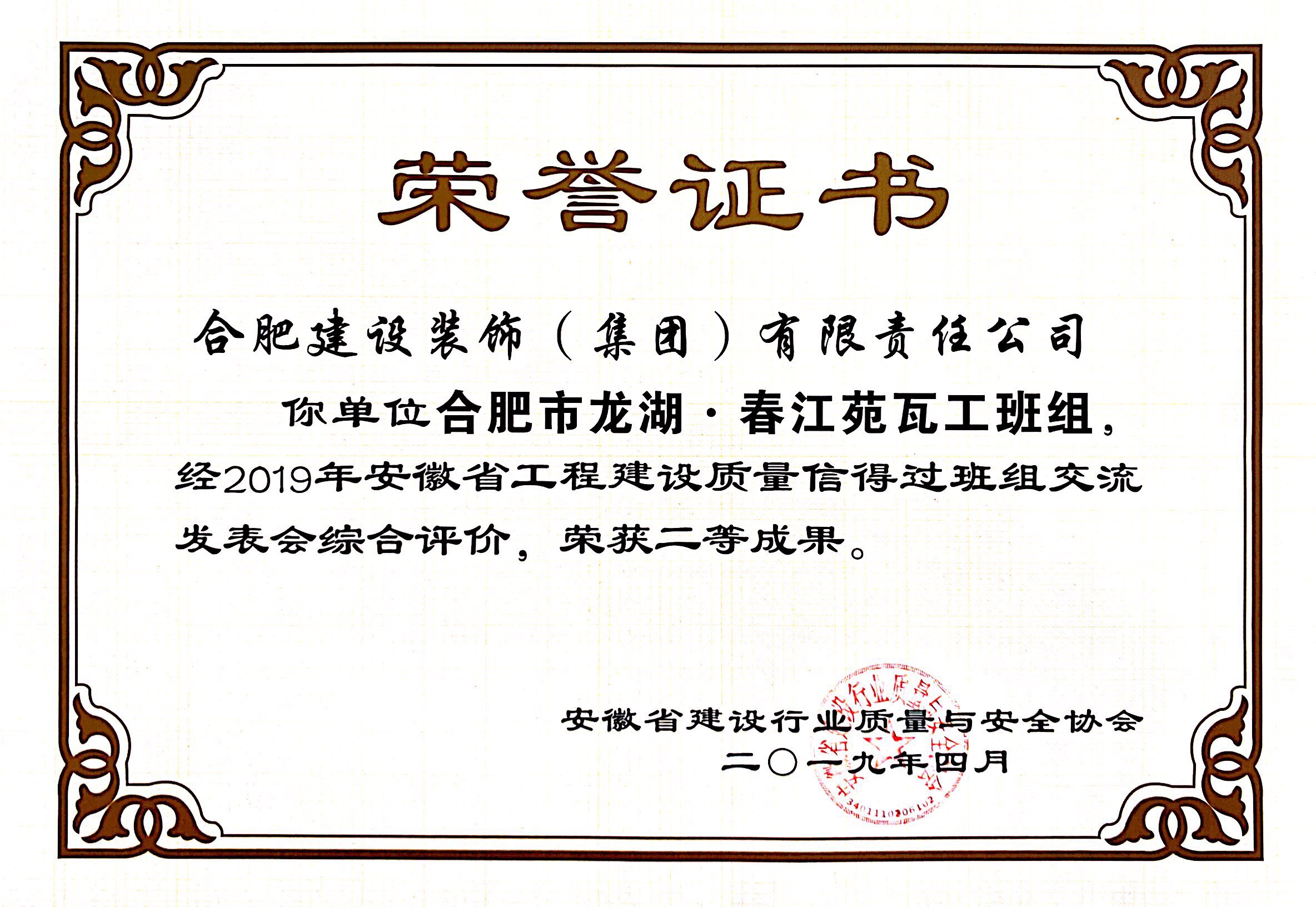 2019年安徽省工程建设质量信得过班组二等成果