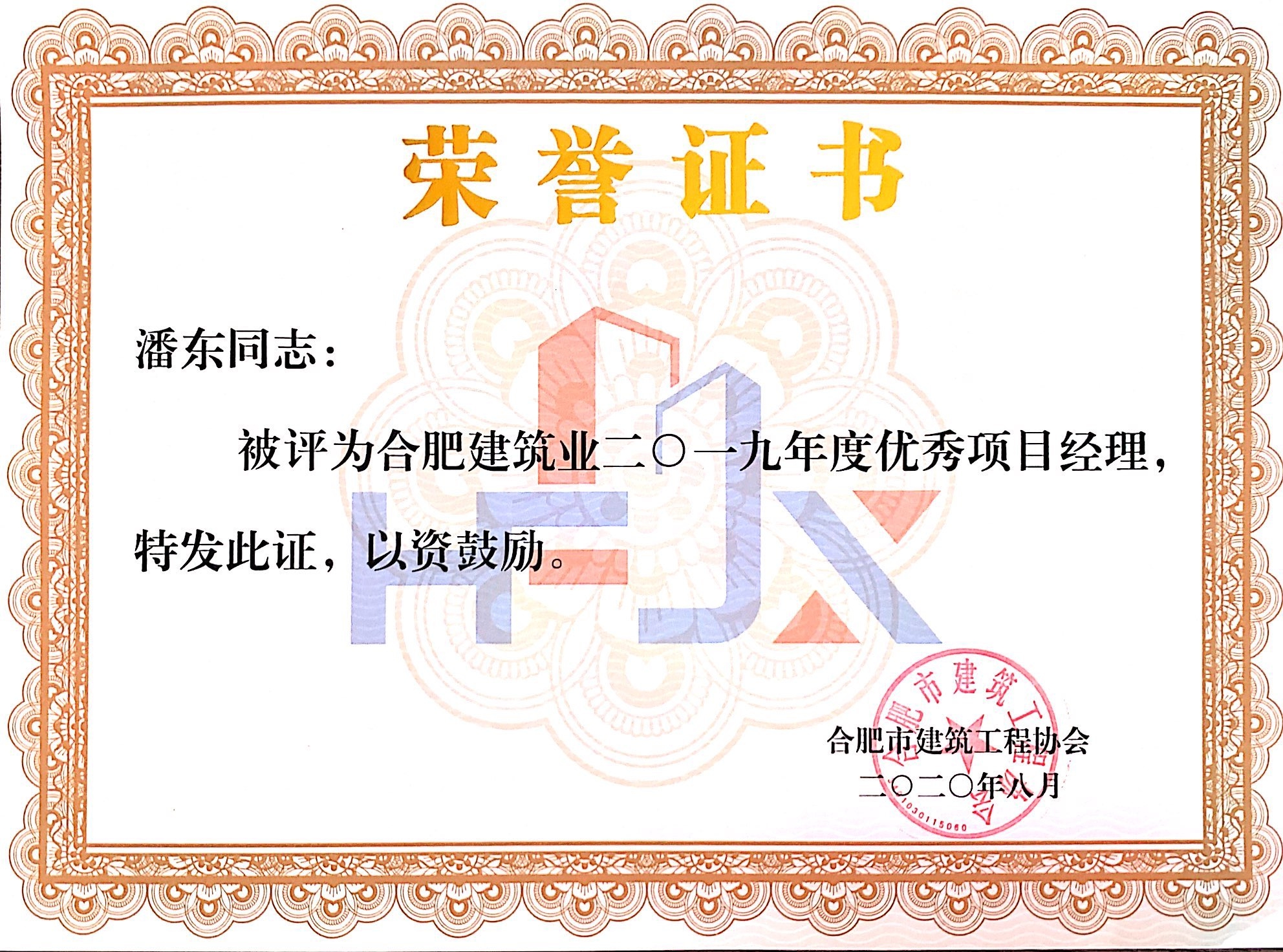 >合肥市建筑业2019年度优秀项目经理——潘东