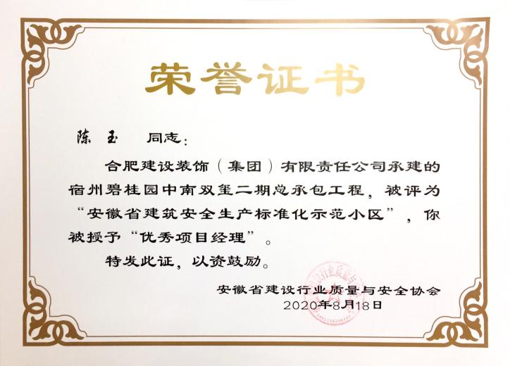>宿州碧桂园中南双玺二期总承包工程——安徽省建筑安全生产标准化示范小区优秀项目经理--陈玉