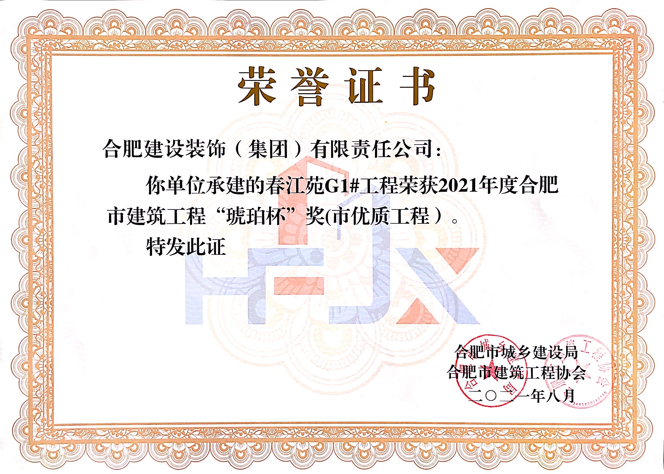 >春江苑G1#--2021年度合肥市建筑工程“琥珀杯”奖(市优质工程)